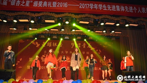 12月15日晚,北京科技大学外国语学院第八届“银杏之星”颁奖典礼暨2016-2017学年学生先进集体先进个人表彰大会在教职工礼堂举行。校党委副书记、纪委书记戴井岗,研究生院副院长韩经,学生工作部、武装部部长盛佳伟,招生就业处副处长王占奎,校团委副书记崔睿,外国语学院党委书记张秋曼、院长张敬源、副院长陈红薇、朱宝善、武冠雄等出席了颁奖典礼。