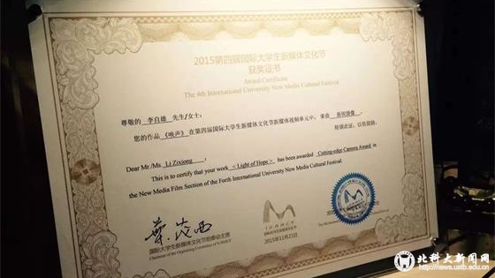 近日,第四届国际大学生新媒体文化节在京举办,我校学生社会实践微电影作品《唤声》荣获新锐最佳摄影奖,《专车市场调查:蜕变之路》、《探寻古建,记住乡愁》分获新锐制片人奖提名和最具人文关怀奖提名。这是学校继去年《粉笔印》荣获最佳导演奖后再次收获最高奖项,入围提名的数量也较去年有新的突破。
