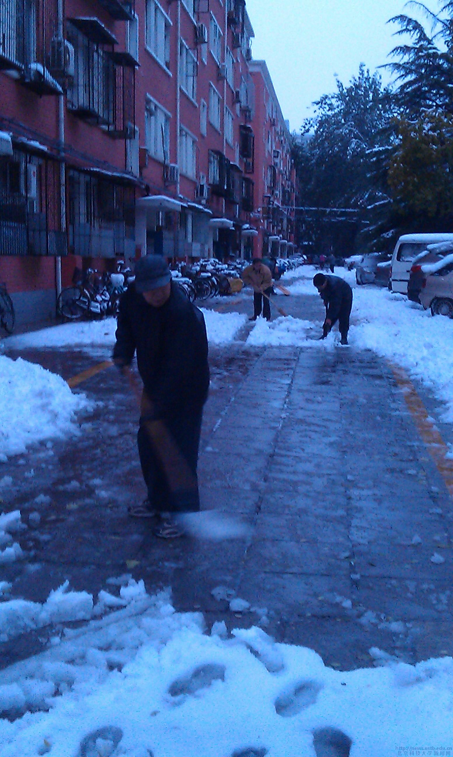为了及时消除下雪给社区造成的不利影响,居委会及时启动突发事件应急预案,早上6点30,居委会杨主任和值班人员就通知相关人员,组织居干、绿化和卫生工人、楼门组长、志愿者等,积极铲雪,很多居民也自发加入到铲雪队伍中来。截至早上10点,社区主要路面和大部门楼栋门前的积雪都已清理干净,全天共有120余人次参加了铲雪行动。