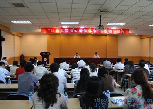 2012年5月24日下午,东北师范大学教授李忠军应邀到我校作了“社会主义核心价值体系”专题辅导报告。校理论中心学习组成员,二级党委书记、副书记,青年高层次人才培训班学员,全校中层干部到会聆听报告。报告会由党委组织部部长孙景宏主持。
