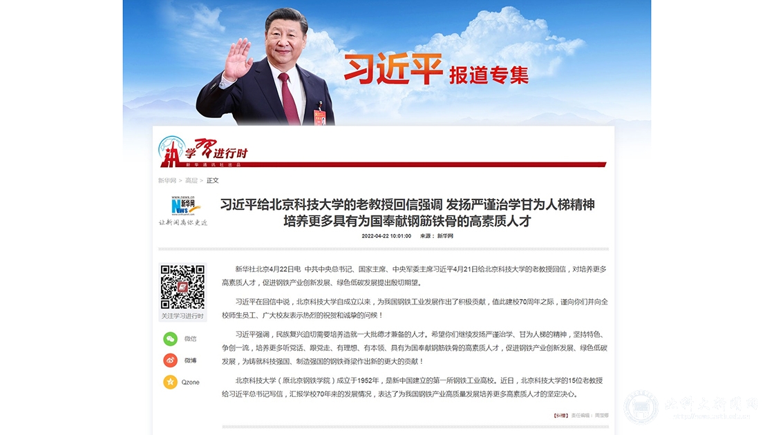 校庆前夕,习近平总书记给北京科技大学老教授们回信。习近平总书记在回信中说,北京科技大学自成立以来,为我国钢铁工业发展作出了积极贡献,值此建校70周年之际,谨向你们并向全校师生员工、广大校友表示热烈的祝贺和诚挚的问候!