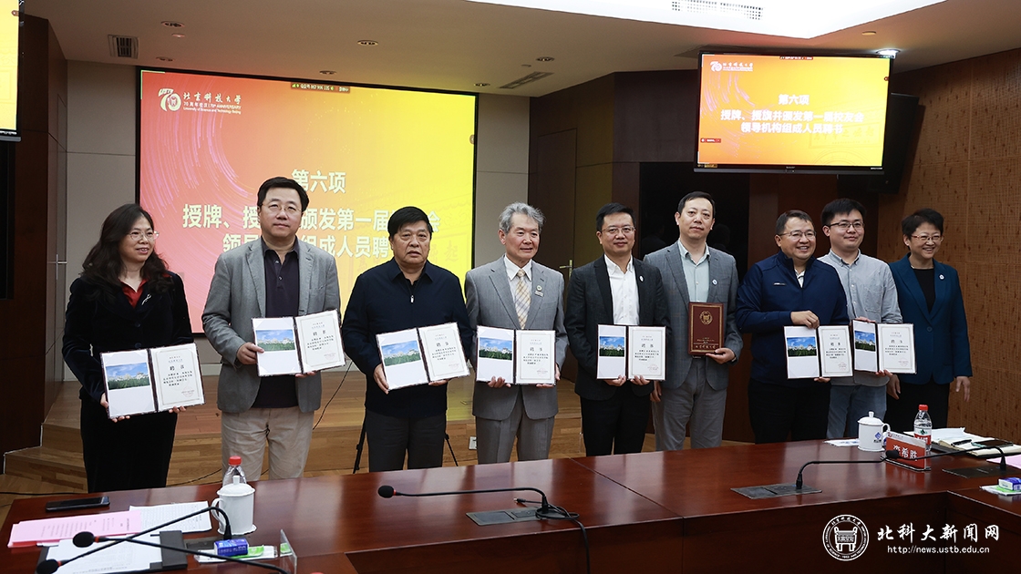 张卫冬为自动化学院校友会第一届名誉会长祝利克、第一届会长尹怡欣授牌授旗。何进主任为名誉会长、会长、副会长、秘书长、副秘书长颁发聘书。