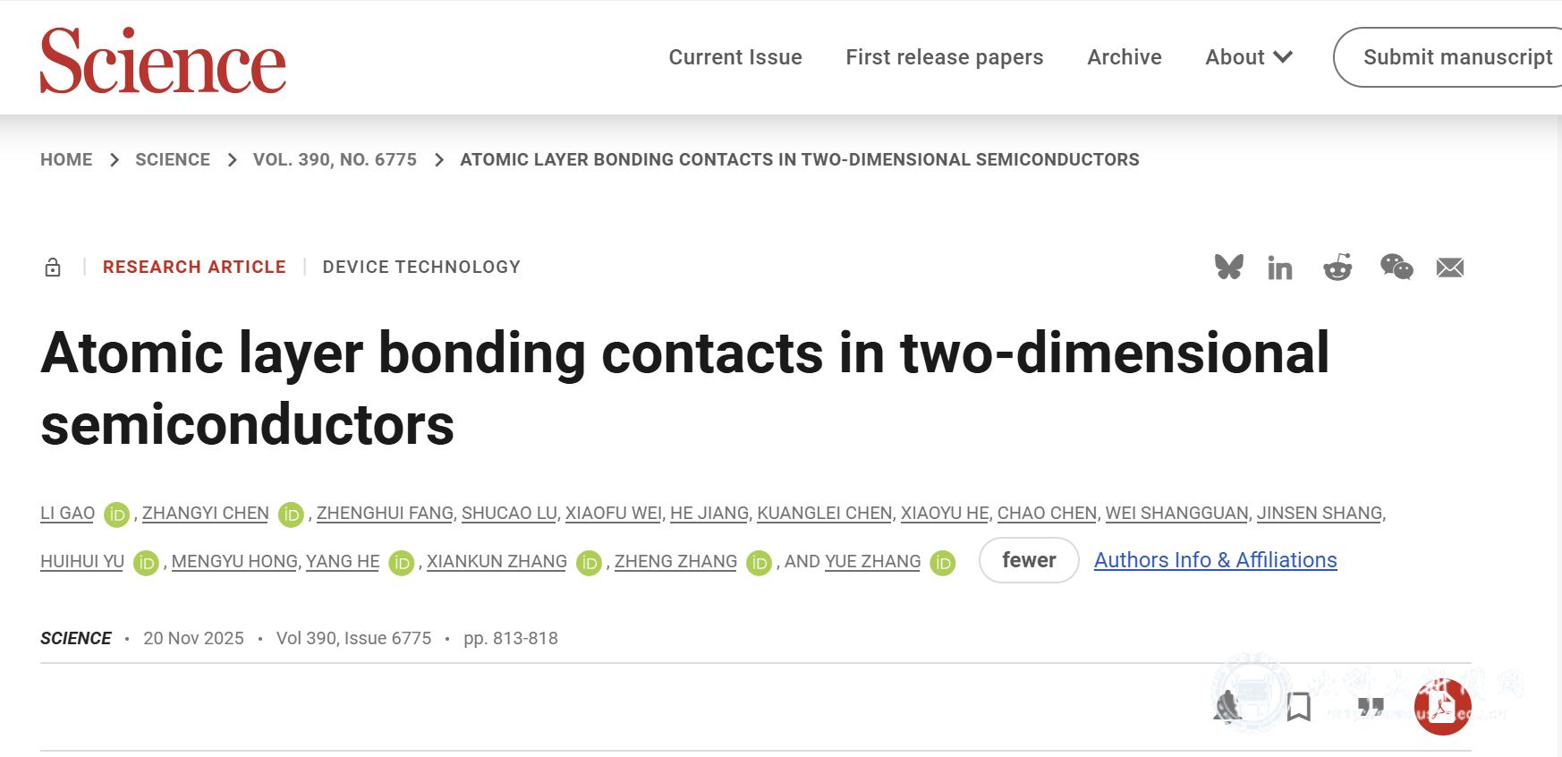 北科大新闻网11月21日电(通讯员 高丽)11月21日,《科学》(Science)发表了我校前沿交叉科学技术研究院的最新研究成果《二维半导体的原子层键合接触》(Atomic layer bonding contacts in two-dimensional semiconductors),Science, 390, 6775, 813-818, (2025)。该项成果在国际上首次提出了“原子层键合”的学术思想,发展了二维半导体材料原子层精准剪裁和异质外延全新技术,首次实现了二维半导体材料与金属电极的原子层键合,突破了二维半导体材料无法满足硅基集成电路后道制造工艺热预算的关键瓶颈,研制出达到集成电路技术路线图指标要求的高性能器件,充分验证了二维半导体材料在未来芯片制造的可行性。