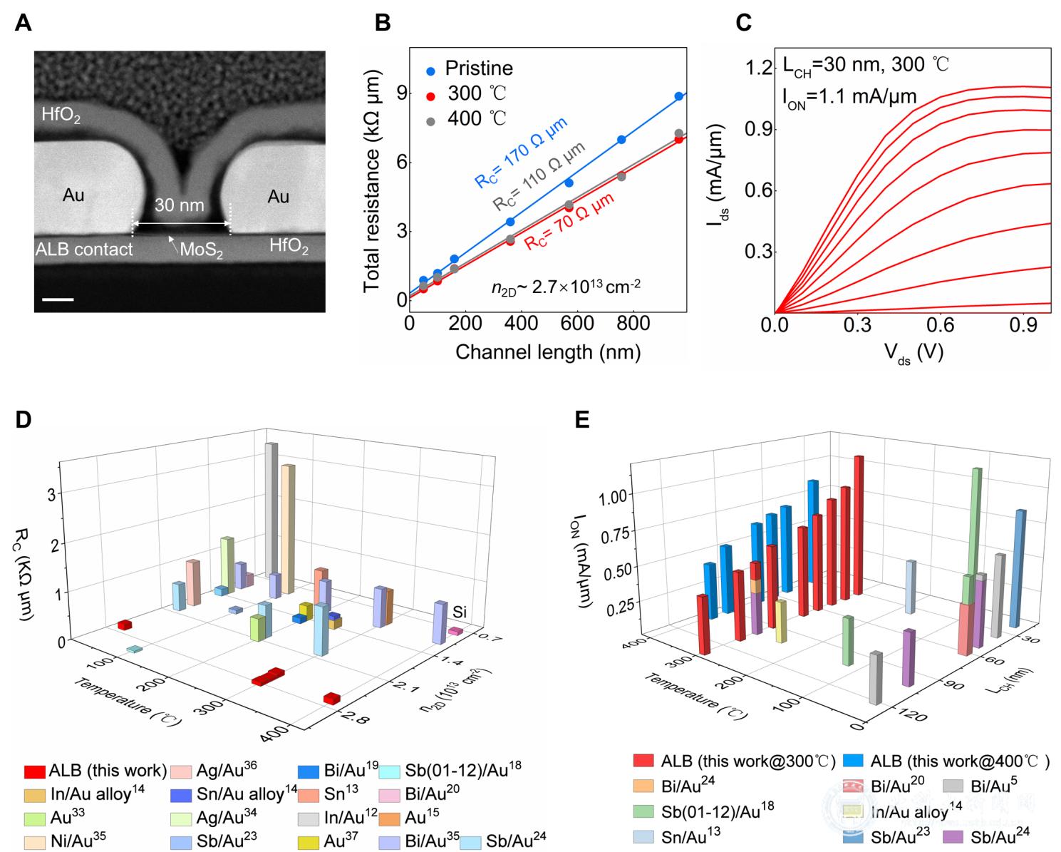张跃院士团队以推动二维半导体材料在集成电路领域的工程化应用需求为导向,针对二维半导体-金属接触问题,创新性提出了原子层键合(Atomic layer bonding, ALB)接触技术。通过精确去除二维半导体材料表面单层硫原子后直接沉积金属电极,实现了过渡金属原子层与金属电极原子层间电子结构和晶格结构的协同调控,成功构筑出兼具强能带耦合和高键合强度的原子层键合接触界面,获得了逼近理论接触极限的、低至70 Ωμm的接触电阻和高达400℃的热机械稳定性,满足国际半导体器件与系统(IRDS)技术路线图中对于高性能电子器件的应用要求。