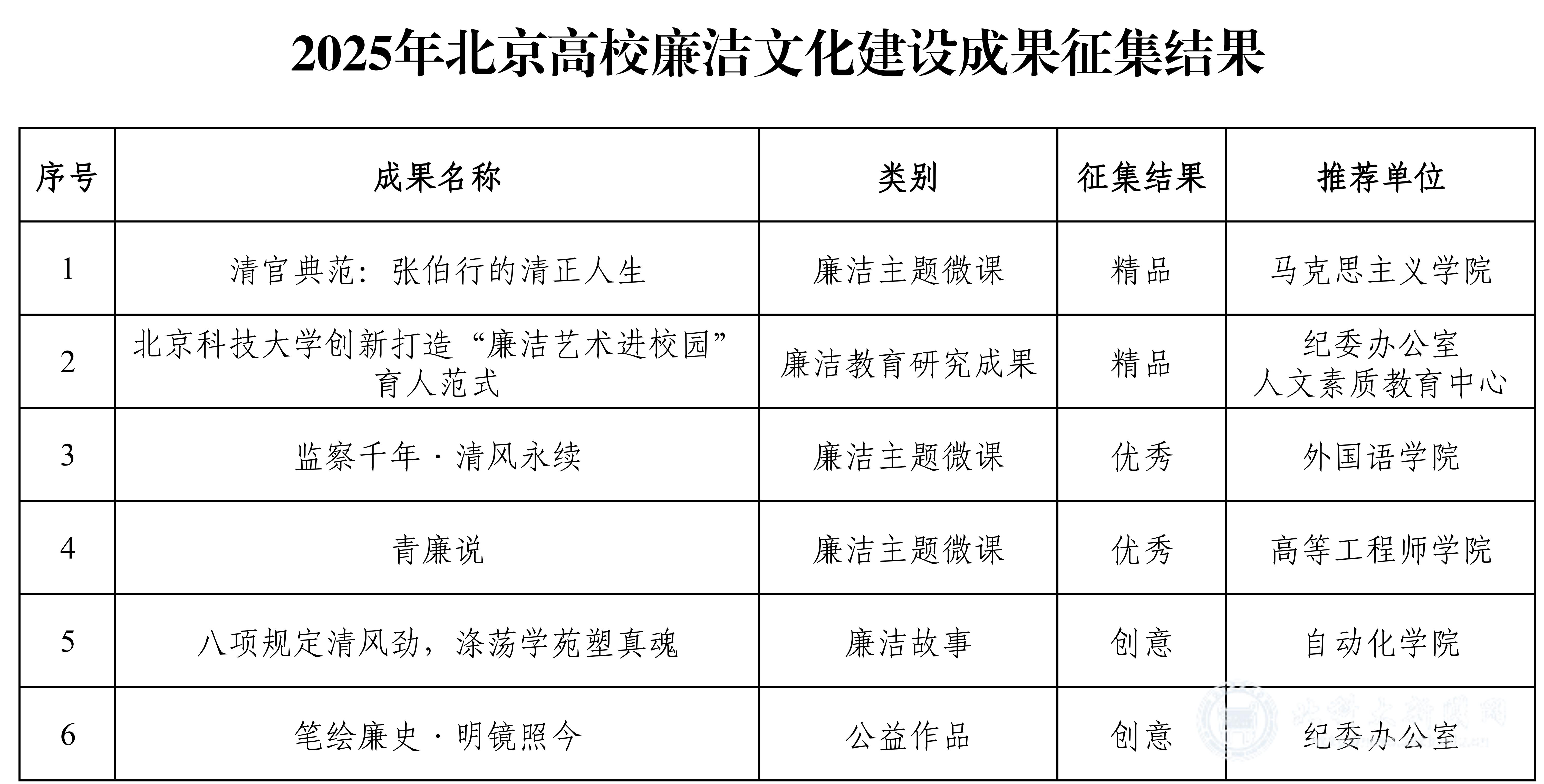 北科大新闻网12月2日电(通讯员 高爽)12月1日,北京市纪委监委、北京市委教育工委公布了2025年北京高校廉洁文化建设成果征集结果。学校选送的6件廉洁文化建设成果获奖,其中精品成果2件、优秀成果2件、创意成果2件,创历年最好成绩,充分彰显了学校廉洁文化建设的扎实成效与创新特色。