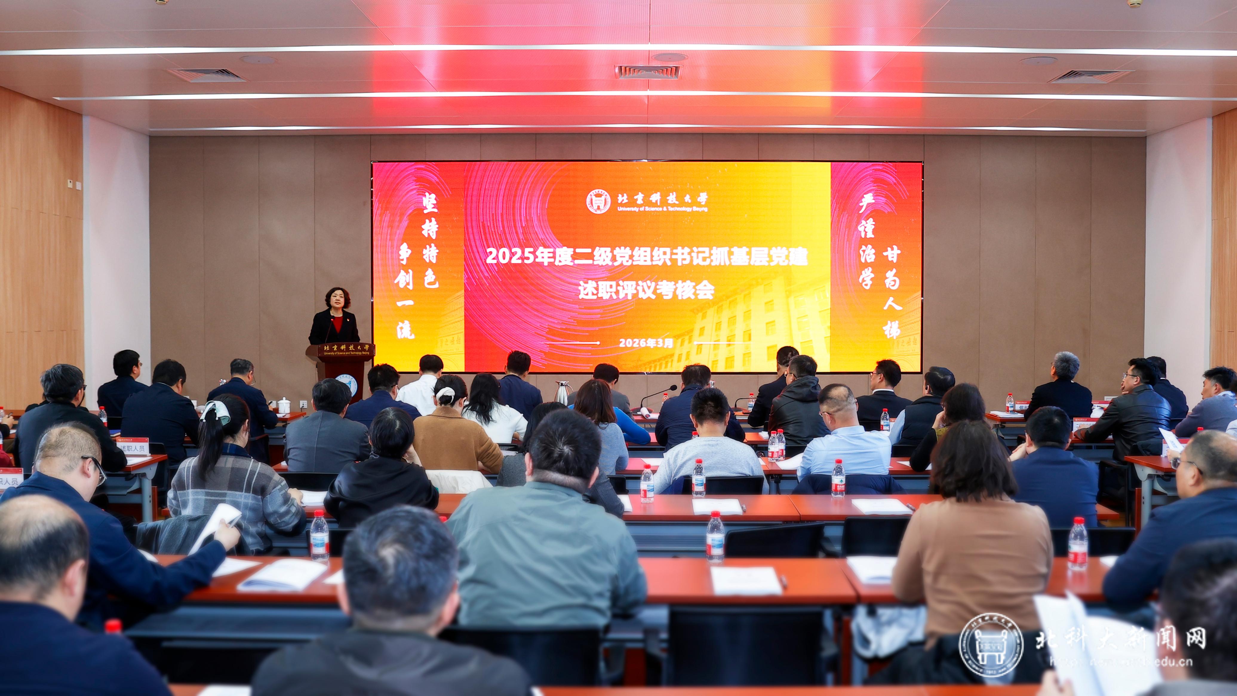 北科大新闻网3月5日电(通讯员 姚惠迎)3月3日,学校党委召开2025年度二级党组织书记抓基层党建述职评议考核会,对全校32位二级党组织书记履职情况进行评议。党委书记徐晓萍对现场述职的二级党组织书记逐一点评。校领导、两委委员、中层正职、“两代表一委员”、师生代表,对抓基层党建工作进行了考核测评。会议由党委副书记孙景宏主持。