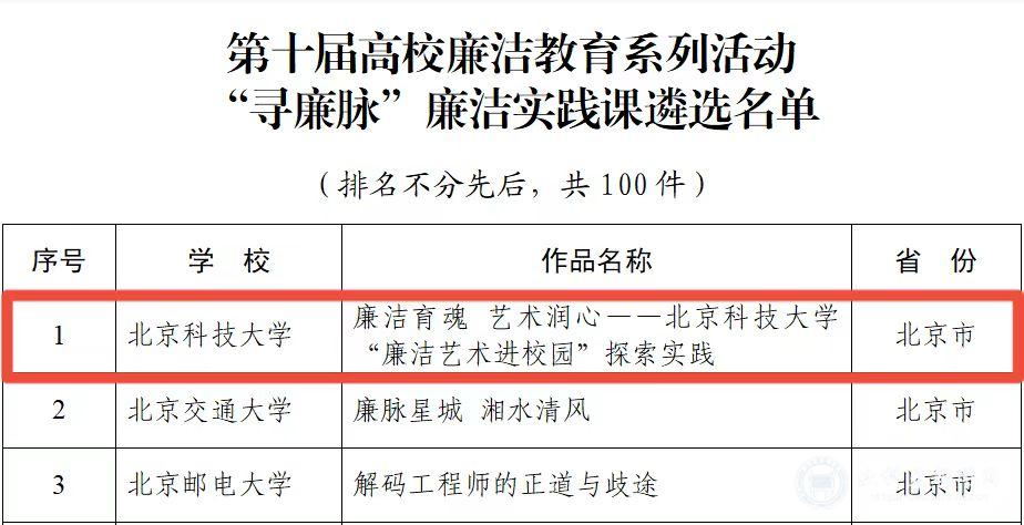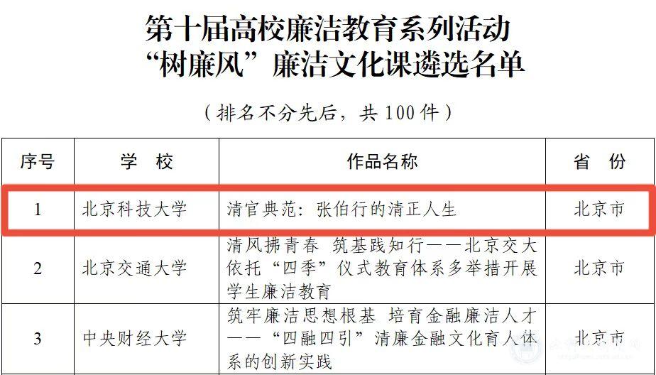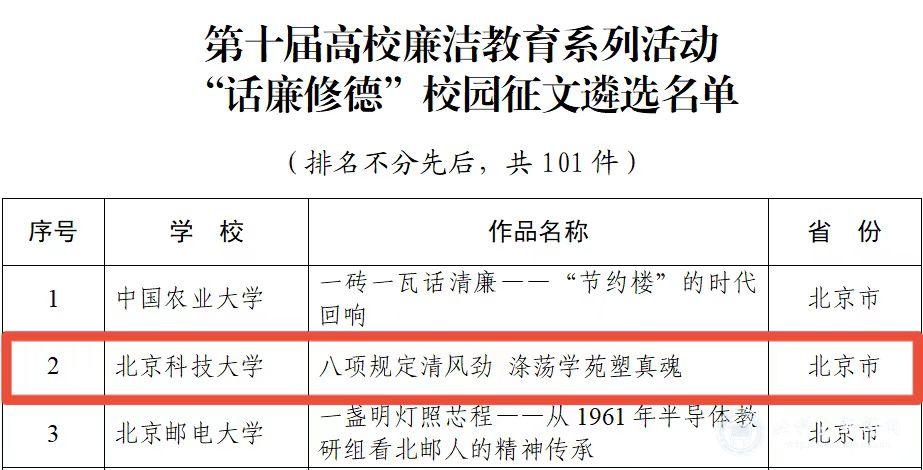 马克思主义学院卢文超报送的《清官典范:张伯行的清正人生》获评“树廉风”廉洁文化课优秀作品。纪委办公室、人文素质教育中心报送的《廉洁育魂 艺术润心——北京科技大学“廉洁艺术进校园”探索实践》获评“寻廉脉”廉洁实践课优秀作品。自动化学院王义轩、王涛、雷嘉懿报送的《八项规定清风劲 涤荡学苑塑真魂》获评“话廉修德”校园征文优秀作品。