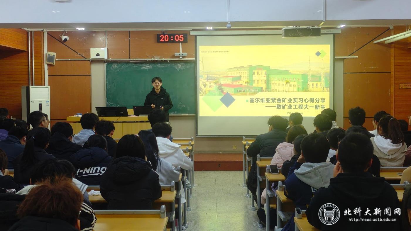 矿加242班沈小川以“行知世界-矿业工程学生赴塞尔维亚紫金矿业实习心得分享”为主题,从当地矿山工艺、人文风情讲到特色美食,以轻松幽默的语言描述了在异国实习的点点滴滴,他重点介绍了紫金矿业公司赴国外矿山工作员工的生活条件、休假制度、工资待遇和公司人文关怀等内容,极大激发了同学们对国际交流和毕业后赴国外矿山工作的热情。