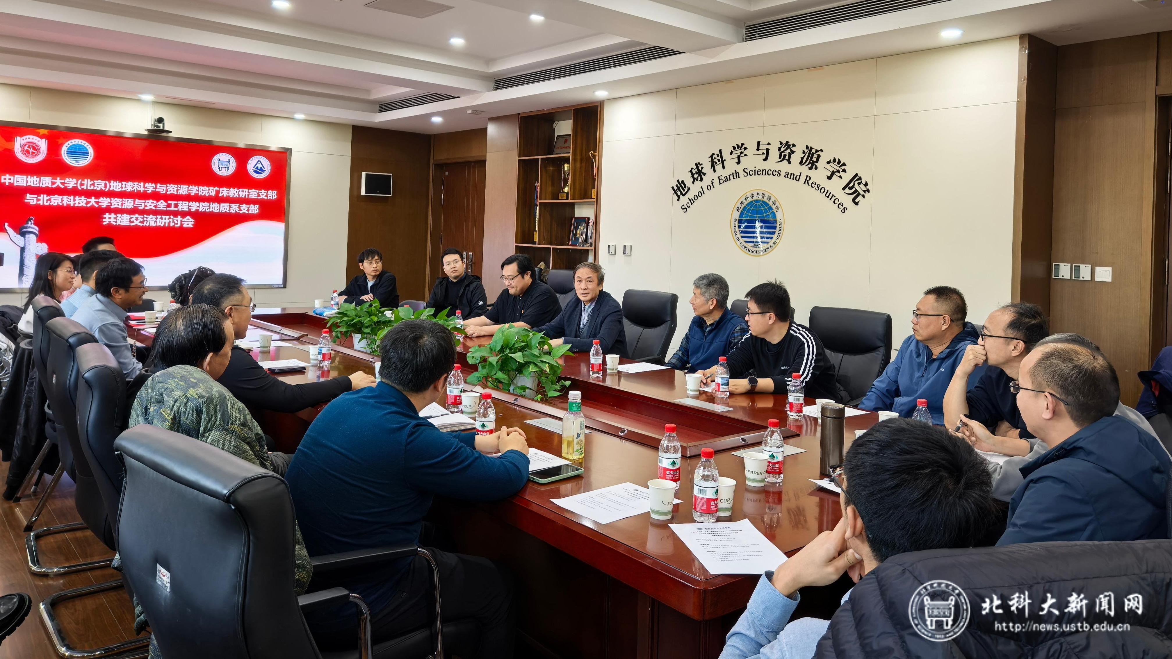 北科大新闻网11月16日电(通讯员 俞佳怡)11月11日,我校资源与安全工程学院地质系党支部与中国地质大学(北京)地球科学与资源学院矿床教研室党支部在中国地质大学(北京)举行了支部共建和交流研讨。中国科学院院士、中国地质大学(北京)原校长邓军,中国地质大学(北京)地球科学与资源学院党委副书记李梦瑜,我校资源与安全工程学院地质系教授谢玉玲,资源与安全工程学院副院长钟日晨,党委副书记、副院长贾兆义和双方支部全体党员教师参加研讨会。
