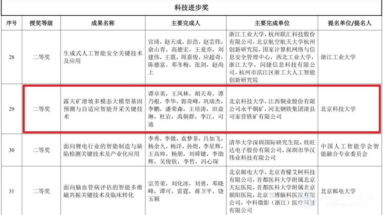 北科大新闻网3月25日电(通讯员 俞佳怡)近日,我国人工智能领域最高奖项之一的“吴文俊人工智能科学技术奖”评选结果揭晓。资源与安全工程学院谭卓英教授团队牵头的“露天矿滑坡多模态大模型基因预测与自适应智能开采关键技术”项目,经激烈角逐,凭借人工智能在矿业领域的技术突破和应用效益,荣获吴文俊人工智能科技进步奖二等奖。