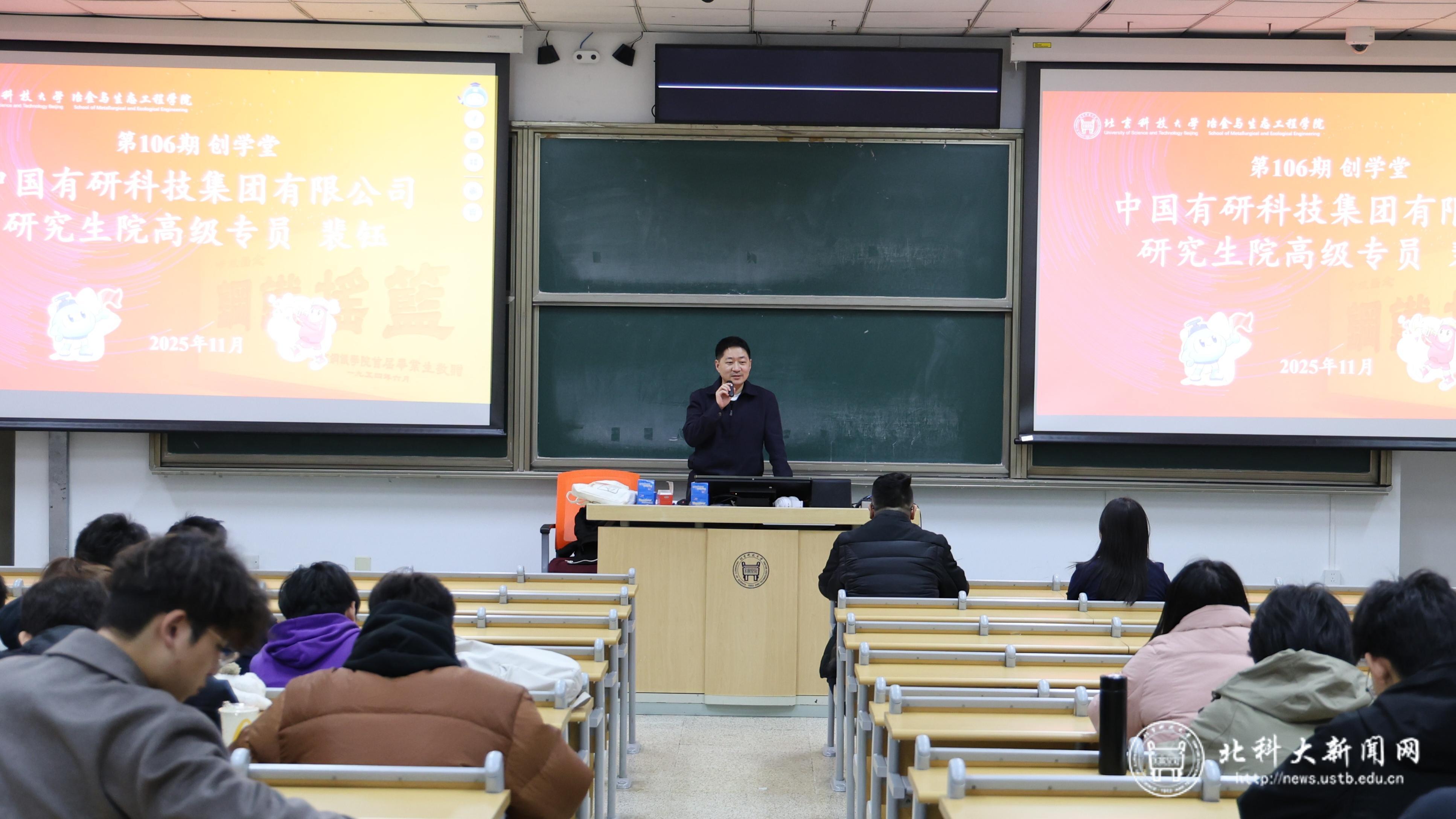 北科大新闻网11月25日电(通讯员 张卓勋)11月24日,冶金与生态工程学院和创新创业学院共同举办的第106期创学堂暨冶金与生态工程学院创新创业竞赛经验分享会在逸夫楼204举办,冶金与生态工程学院党委副书记、副院长康泰出席,本次活动特邀中国有研科技集团有限公司研究生院高级专员裴钰、冶金与生态工程学院2022级博士生叶涟进行分享,60余名2025级本科生参与。