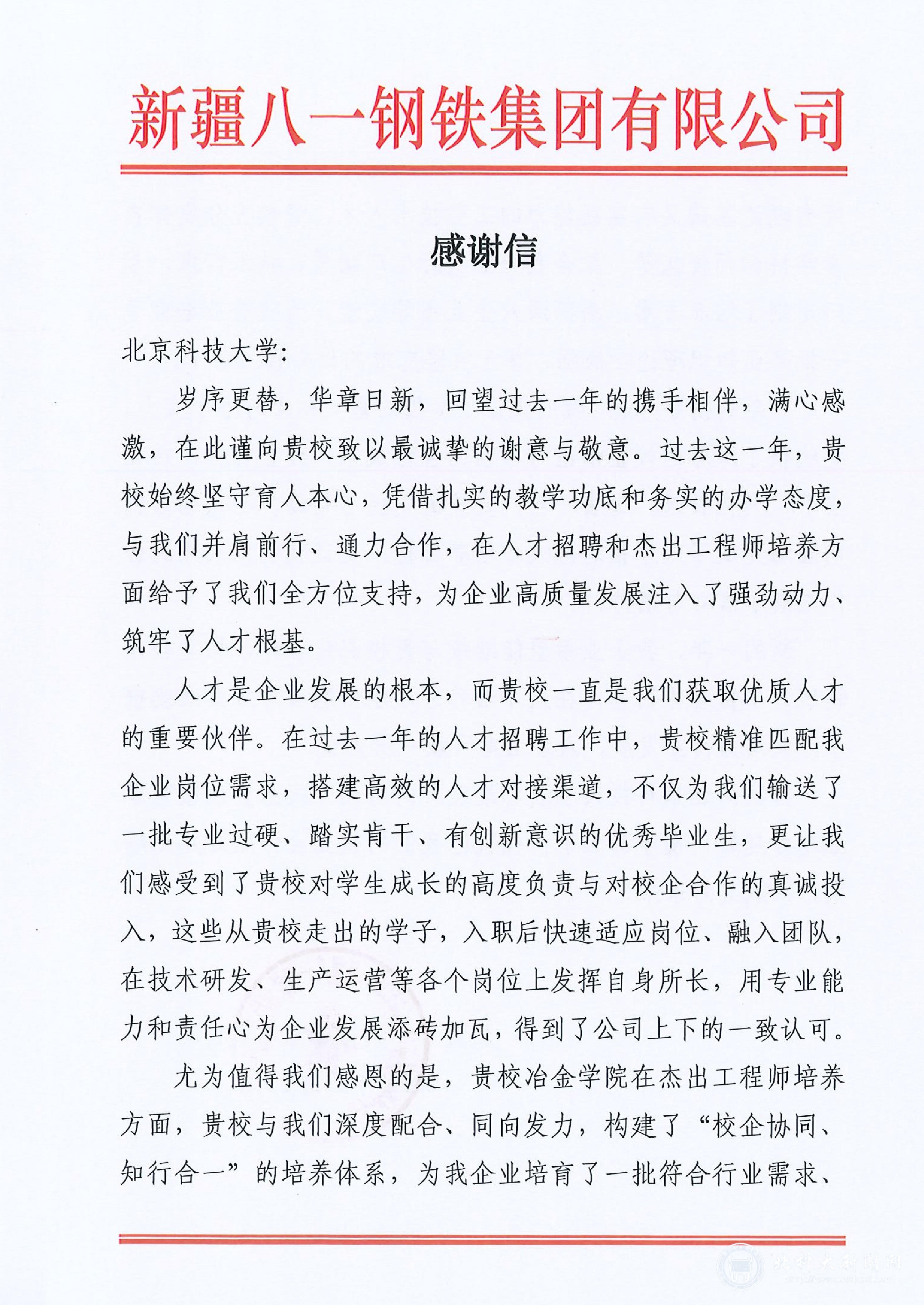 北科大新闻网2月11日电(通讯员 张卓勋)2月10日,新疆八一钢铁集团有限公司向学校发来感谢信,特别对冶金与生态工程学院在杰出工程师培养方面的卓越贡献给予高度肯定。