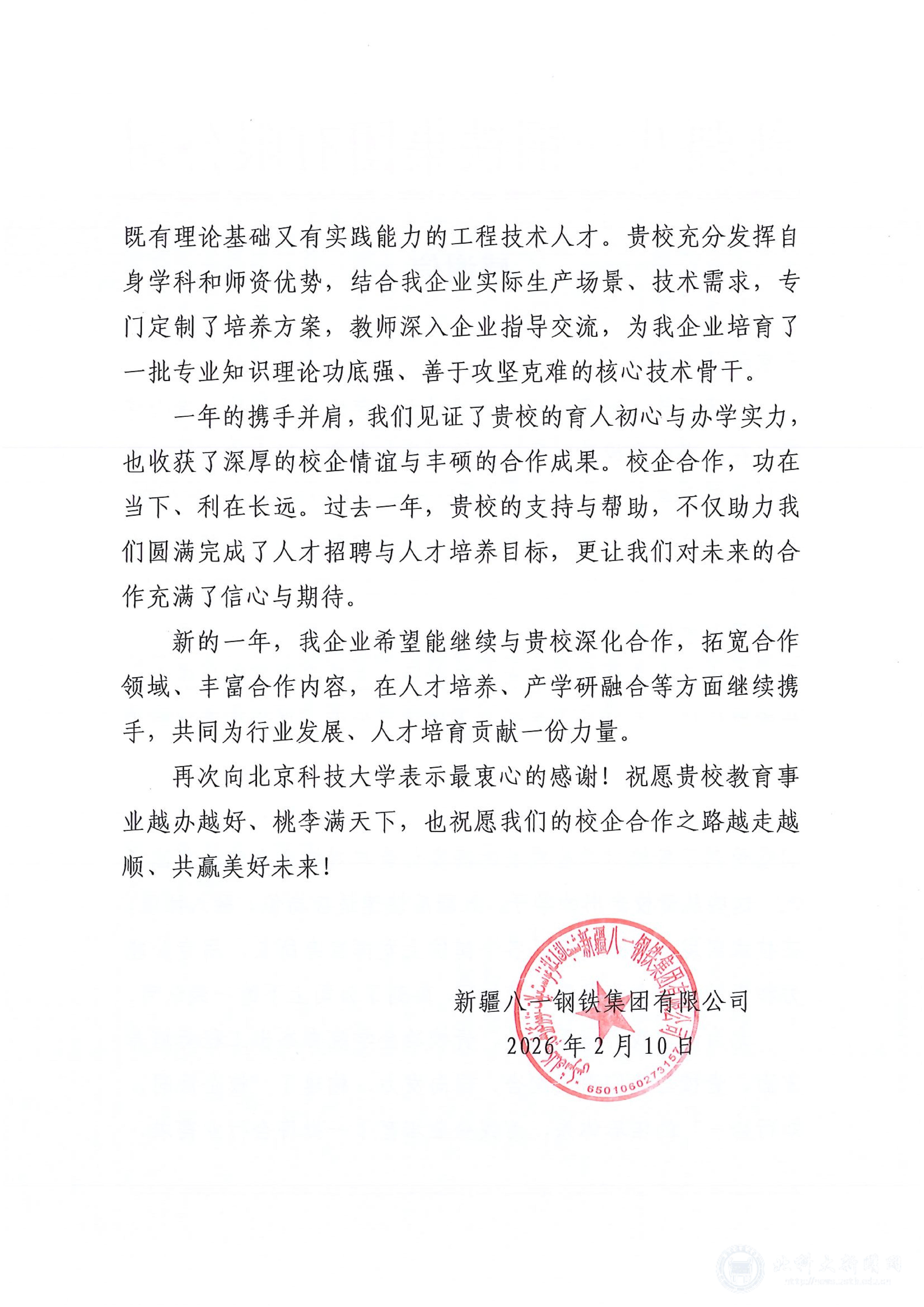 信中感谢学院坚守育人初心,通过构建“校企协同、知行合一”的培养体系,为企业量身定制培养方案,输送了一批理论基础扎实、实践能力突出、善于攻坚克难的核心技术骨干。这些毕业生在技术研发与生产运营岗位上快速成长,成为推动企业高质量发展的中坚力量。八一钢铁集团表示,愿与学院进一步深化校企合作,拓宽合作领域,在人才培养与产学研融合方面携手共进,共创美好未来。