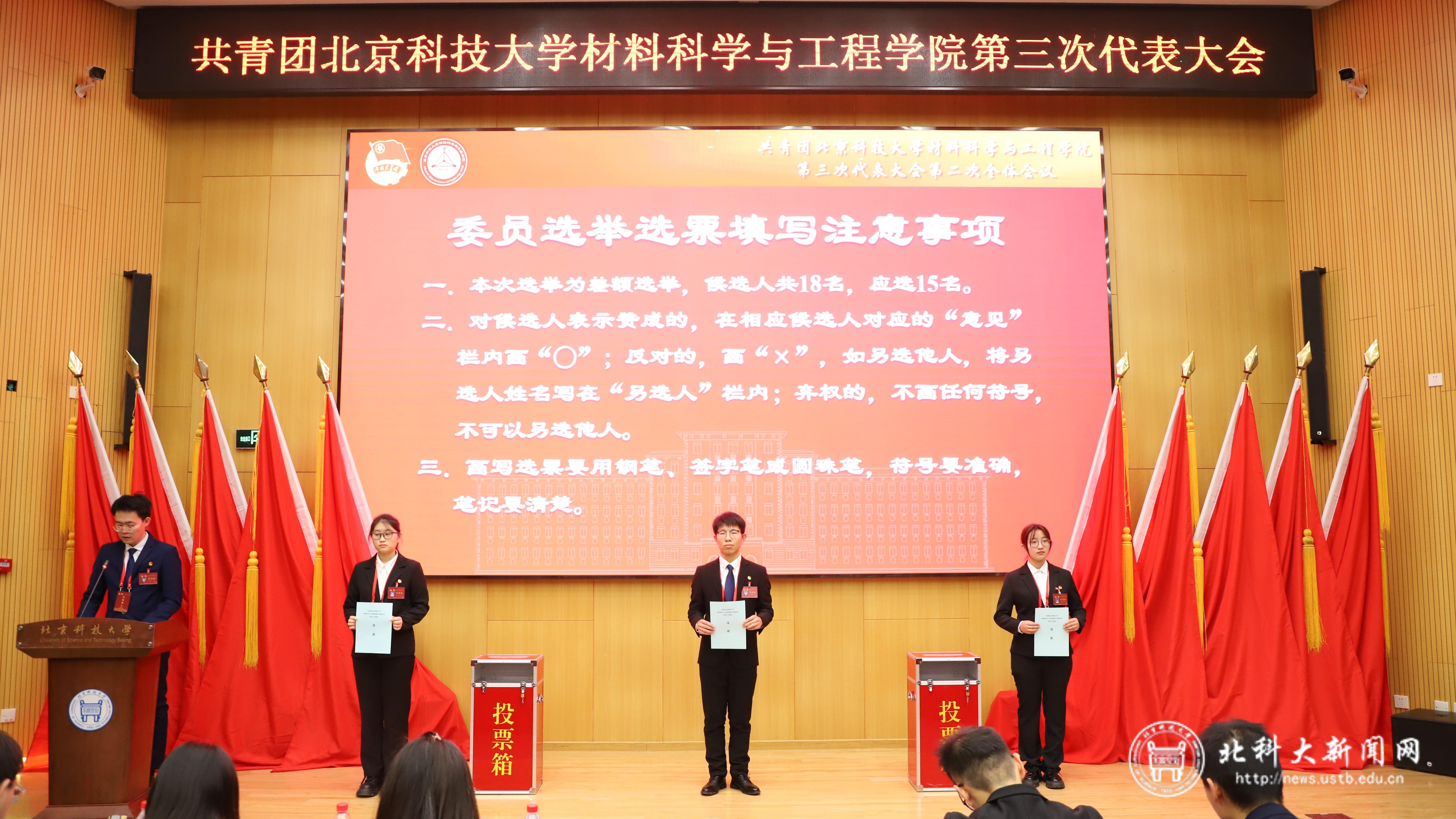 大会闭幕式在学术报告厅举行。会上,总监票人王炜祺报告了选举计票结果,秘书长于潇宣布了经过无记名投票选举产生的由15人组成的共青团北京科技大学材料科学与工程学院学院第三届委员会委员,并宣布新一届委员会第一次全体会议召集人。与会代表审议并通过了团委工作报告决议(草案)。