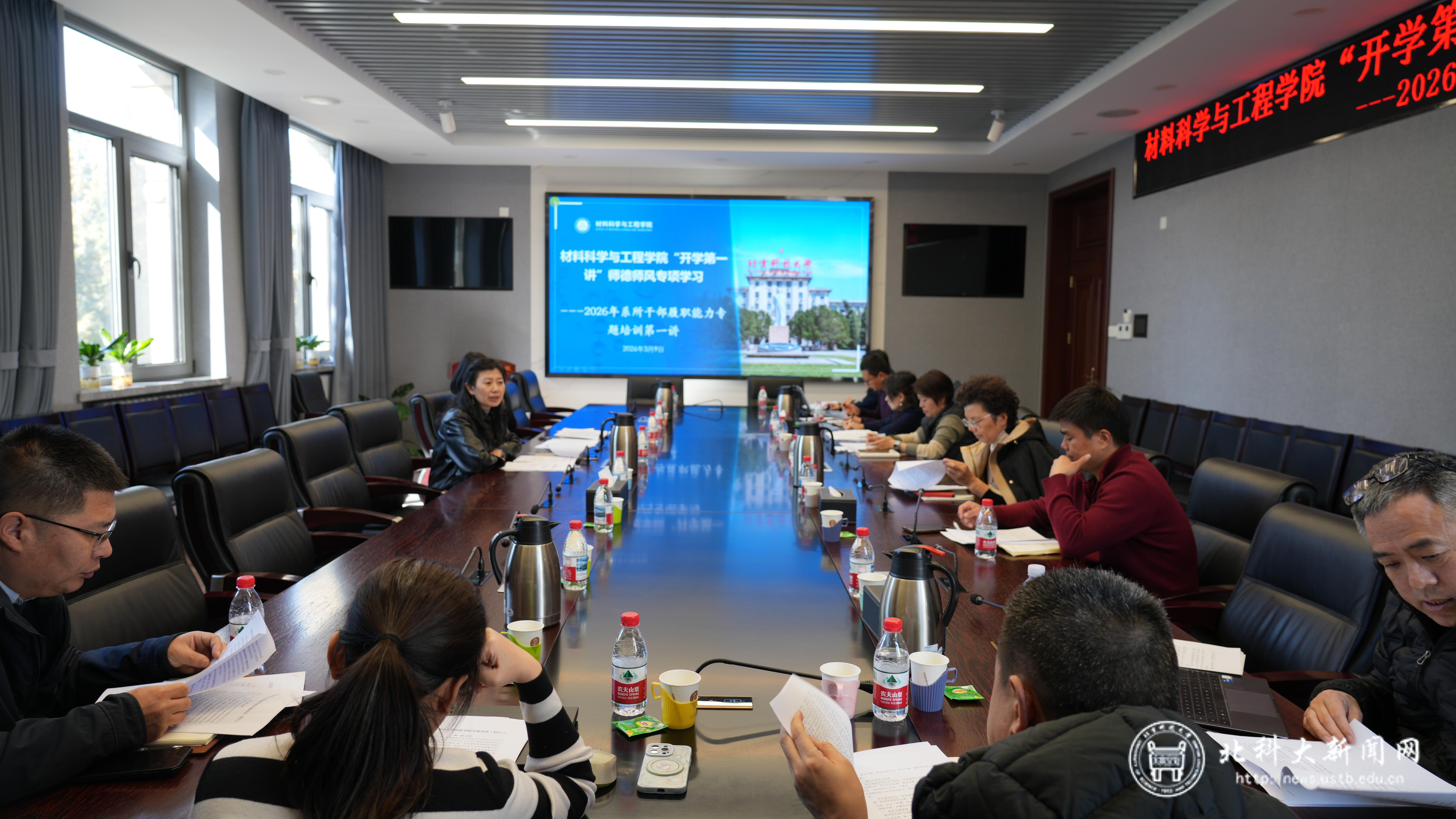 北科大新闻网3月10日电(通讯员 周道敏)为提高系所干部履职能力和开展教职工思政工作水平,材料科学与工程学院自2022年起一直坚持举办系所干部系列培训班。3月9日,2026年系所干部“履职能力培训专班”暨师德师风“开学第一讲”集体备课在主楼313第一会议室顺利举行,学院领导班子成员、各系所中心主任、教工党支部书记参加了培训。培训由学院党委书记张秋曼主讲。
