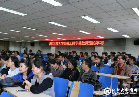4月14日下午,机械工程学院教师理论学习活动在机电楼106展开。本次理论学习的主题是:依法构建和谐劳动关系,推进工会工作法制化建设——《北京市实施< 中华人民共和国工会法>办法解读》。本次集中学习由机械工程学院党委书记马飞主持,工会主席景志红主讲,学院全体教职工参与了本次学习。