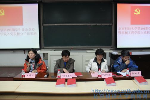 2012年10月16日晚7时,北京科技大学第194期学生业余党校暨机械工程学院入党积极分子培训班开学典礼在机电楼106顺利举行。出席本次典礼的领导有校学生工作部部长何进老师、机械工程学院党委书记臧勇教授、机械工程学院党委副书记董春阳老师、机械工程学院张咏梅老师、党校各班班主任以及党校学员。