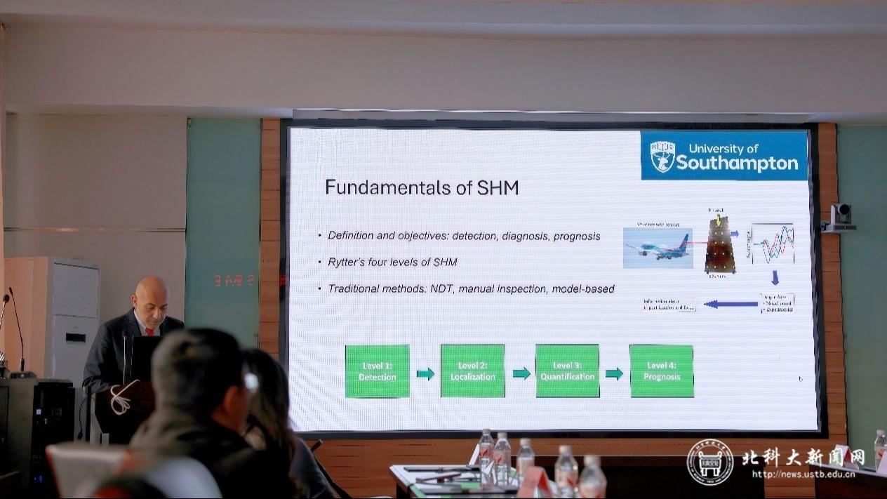 讲座中,Scarselli教授从航空航天结构健康监测(SHM)的基础理论切入,系统阐述了该技术在保障飞行器安全运行、延长结构使用寿命中的核心价值。他回顾了航空航天结构健康监测技术与机器学习方法的发展历程,指出随着航空航天装备向高性能、轻量化、长寿命方向演进,传统物理模型与数据驱动监测方法在应对海量数据、复杂结构特征及多工况环境时的局限性,强调机器学习技术与传统监测方法的融合是领域发展的必然趋势。