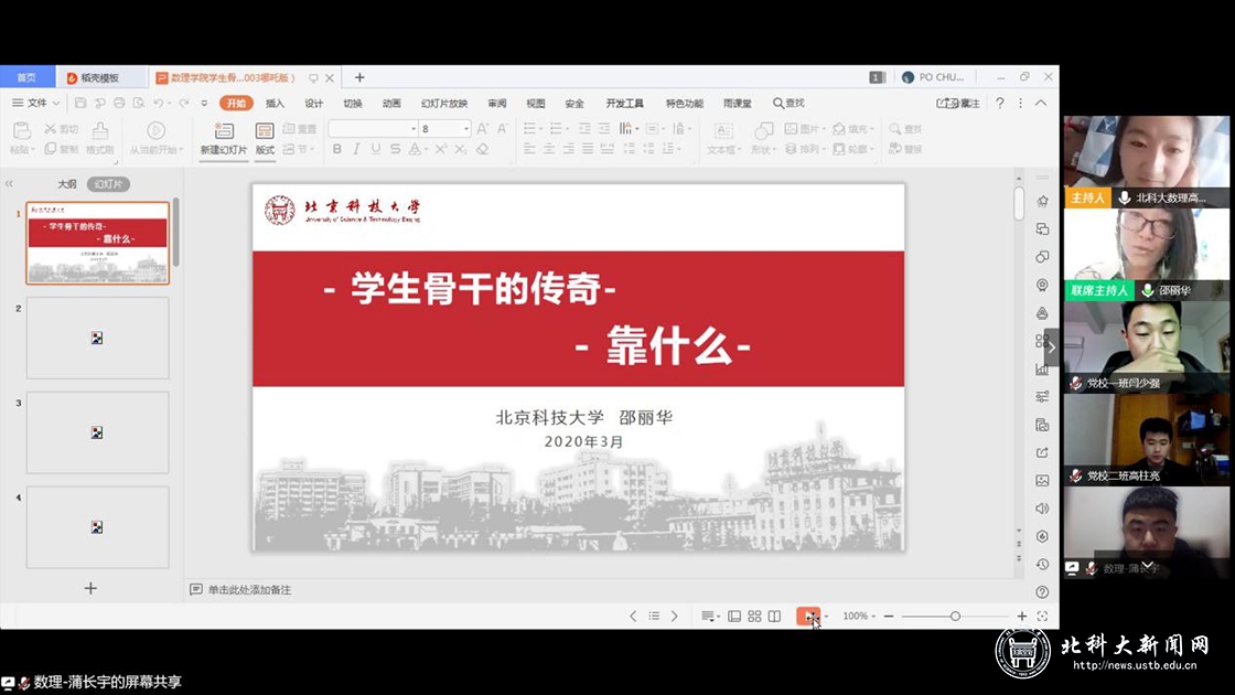 3月19日下午,数理学院通过腾讯会议开展了党校团校第二讲线上活动。本次讲座邀请到数理学院数学2005级优秀院友、北京科技大学团委副书记邵丽华老师作为主讲老师,数理学院党团校班主任、小班主任及全体学员参加会议。会议由数理学院代团委书记高爽老师主持。