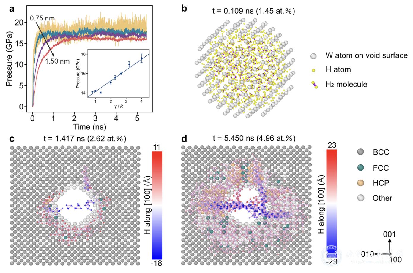 钨因其优异的热物理性能和低溅射产额,被选为核聚变反应堆中面向等离子体的主要候选材料之一。在服役过程中,来自等离子体边界层的高通量低能氢同位素(氘、氚)会注入钨材料内部,这些氢原子被微观缺陷捕获后逐渐聚集,成核并生长为高压氢气泡。氢气泡的演化及其内压积累会显著恶化材料的力学性能,增加第一壁结构材料的脆性断裂风险。然而,受限于实验表征手段的空间分辨率,对纳米尺度氢气泡内部结构的原位观测及氢压的定量测量几乎无法实现。本研究构建了高精度W-H二元机器学习势函数,结合分子动力学模拟,首次从原子尺度系统揭示了钨中纳米孔洞内氢的聚集行为与结构特征,阐明了氢压演化对氢泡力学响应的影响机制。