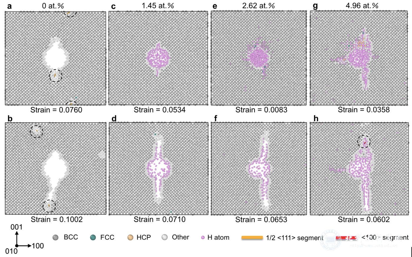 进一步的拉伸模拟表明,氢的存在显著改变了钨的断裂行为,观察到明显的氢致韧脆转变。含氢样品的断裂路径严格沿{100}面片状氢团簇扩展,断裂面平整且严格沿{100}面解理,这一微观特征与实验中观察到的{100}面空腔形貌高度吻合,为理解氢致脆化的微观机制提供了直接证据。