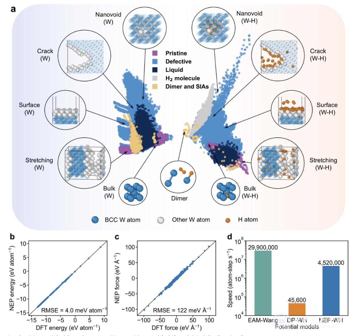 研究团队采用主动学习策略,对丰富的钨-氢二元构型空间进行了系统采样,成功开发了具备广泛应用场景的机器学习势函数NEP-WH。该势函数在保持高计算效率的同时,实现了对W-H相互作用的高精度描述。