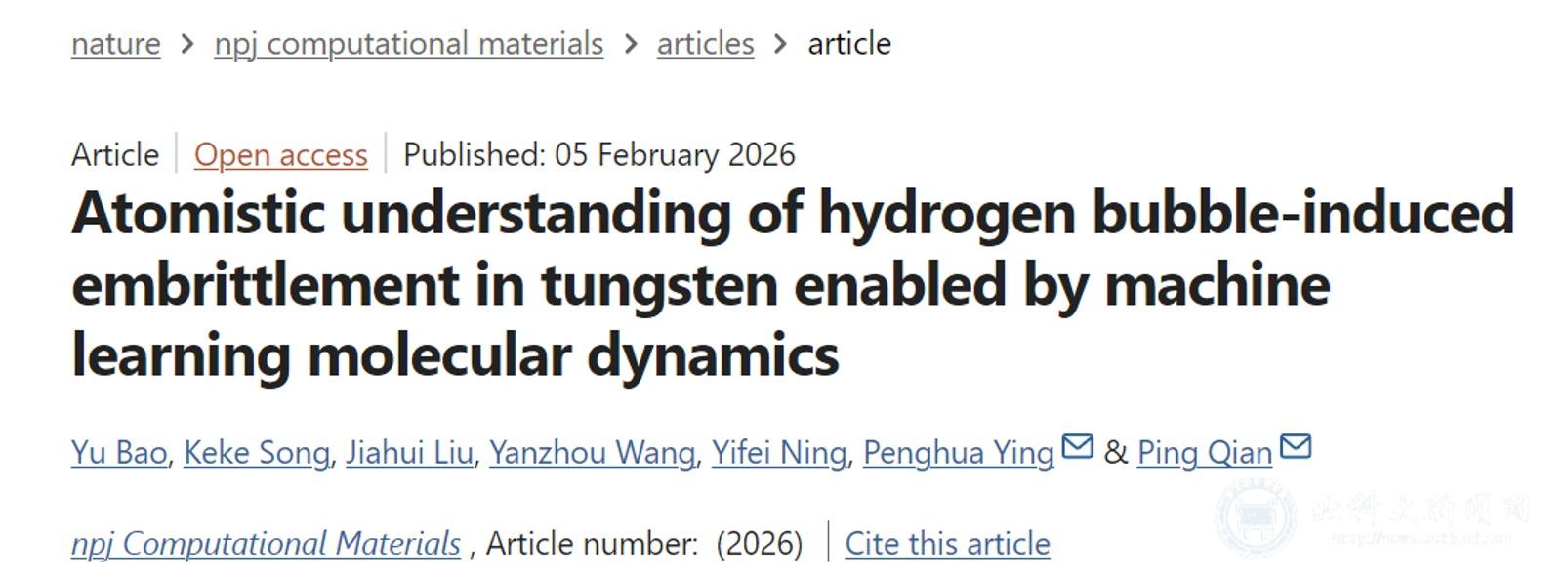 北科大新闻网3月5日电(通讯员 张泽华)近日,数理学院钱萍教授团队在钨中氢致损伤研究方面取得重要进展。该成果以“Atomistic understanding of hydrogen bubble-induced embrittlement in tungsten enabled by machine learning molecular dynamics”为题发表在国际顶级期刊《npj Computational Materials》(IF:11.9,物理学1区)。第一作者为数理学院博士研究生包钰,共同第一作者为学院已毕业博士宋可可。