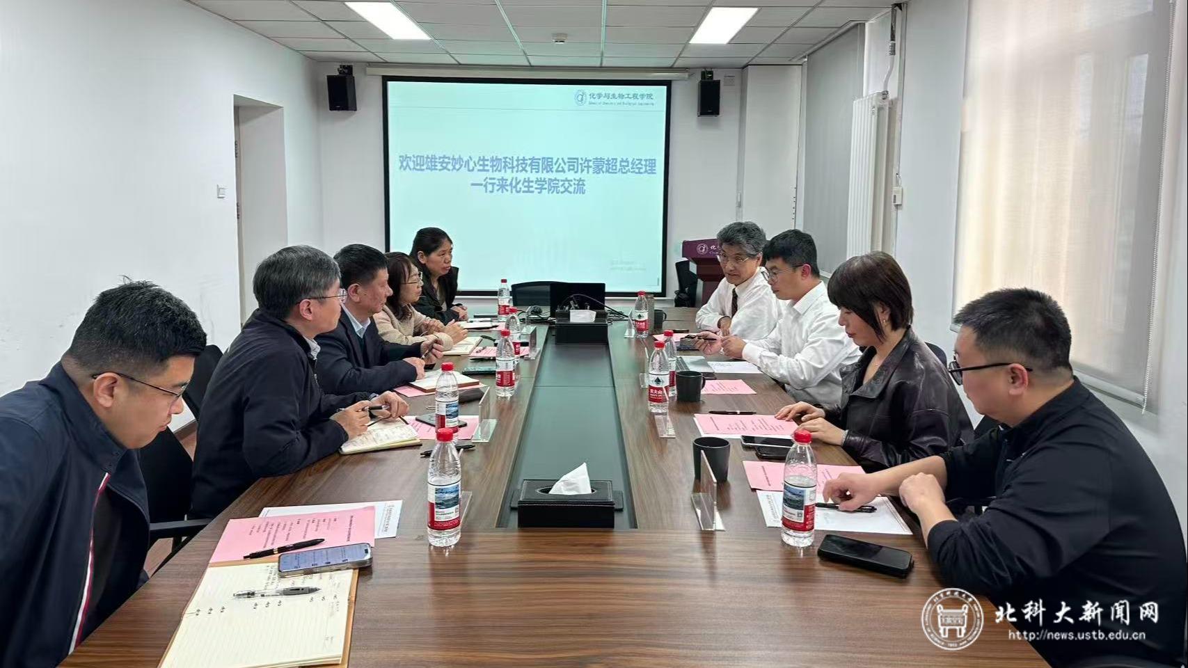 北科大新闻网3月27日电(通讯员 陈晨煜)3月26日,雄安妙心生物科技有限公司与化学与生物工程学院合作交流会议在化生楼215会议室举行。双方围绕科研合作、人才培养及联合申报科研平台等议题深入交流,达成多项合作共识,共同推动学院服务雄安新区战略布局。