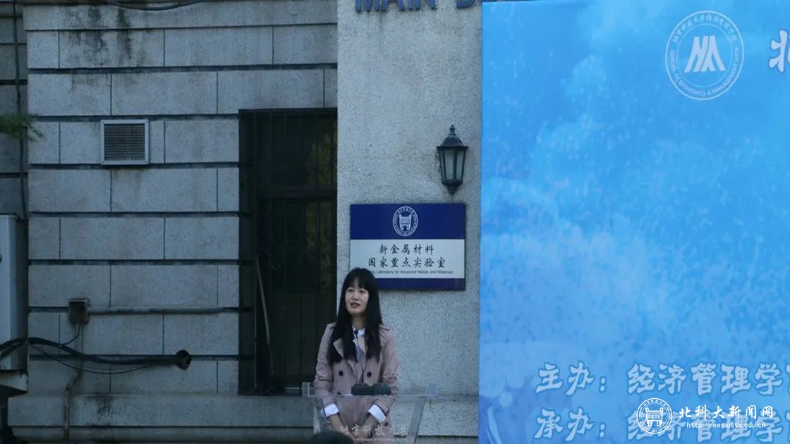 随后,新生代表工商2007班周雨桐发言。她表示,疫情来临,高考延期,每一位同学都忍受着孤独,不断践行着自律。而今大家相聚北京科技大学,相聚经管学院,就更应当以不懈的努力和坚定的意志重塑自我,砥砺前行。在新的时代机遇下,新一代小贝壳会扛起时代重任,做一朵奋起直追的后浪,用时间铸就梦想,以汗水回报社会,扬起远航的风帆,做自己人生的执笔人。