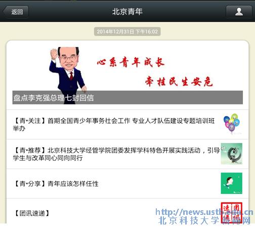 2014年12月31日,北京团市委微信公众平台订阅号“北京青年”全文刊发了《东凌经济管理学院团委社会实践工作纪实》一文,在全市共青团组织范围内分享东凌经济管理学院团委以“与改革同心同向同行”为主题开展社会实践组织工作、取得一系列突破性成果的情况。“北京青年”是北京团市委以微信订阅形式向广大团干部、青少年发布通知、传递政策、宣传工作和交流互动的全新信息发布载体。这也是全校各学院团委工作首次获得该信息平台的宣传。