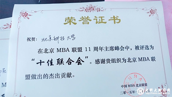 本次会议中,北京科技大学被评为北京MBA联盟“十佳联合会”,北京科技大学东凌经济管理学院被评选为“十大突出贡献商学院”,2011级MBA联合会刘自卫主席荣获“北京MBA联盟十大杰出贡献奖”奖项。