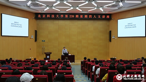 5月30日,北京科技大学第239期星期四人文讲座在学术报告厅顺利开展。Mark Buck教授受邀进行“The United Kingdom and the European Union”主题演讲。人文素质教育中心副主任韩学周、德国外教Christian Glüer、公共管理系副教授崔英、18级辅导员马昭文出席。本次活动由赖依娃主持。