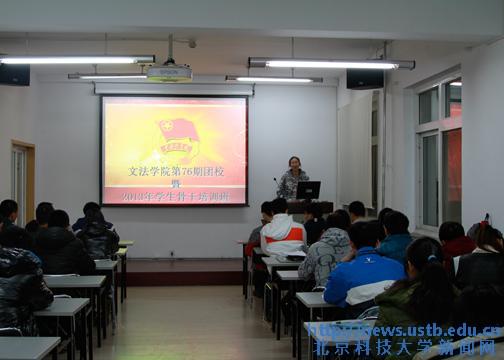 2013年11月28日晚19:00,文法学院第43期团校培训暨2013学生骨干培训班第二讲在文法楼102教室顺利举行。文法学院团委副书记、2012级辅导员于林民老师,团委副书记张洋同学和校团委实践部崔睿部长以及2011级、2012级全体学生干部参与此次培训。此次培训特意邀请校团委实践部崔睿部长作为此次培训的主讲人与各位学生干部分享团学工作经验。此外,本次培训邀请了刚从部队退伍返校的三名文法学院2010级同学为大家讲述了他们两年的励志军旅生活。