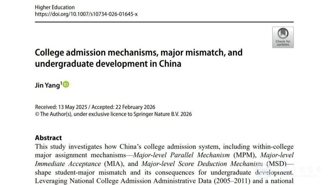 北科大新闻网4月9日电(通讯员 李奕明)近日,教育研究院青年教师杨晋博士以独立作者身份撰写的学术论文《College admission mechanisms, major mismatch, and undergraduate development in China》正式发表于国际高等教育研究领域顶级期刊Higher Education(2026 年)。
