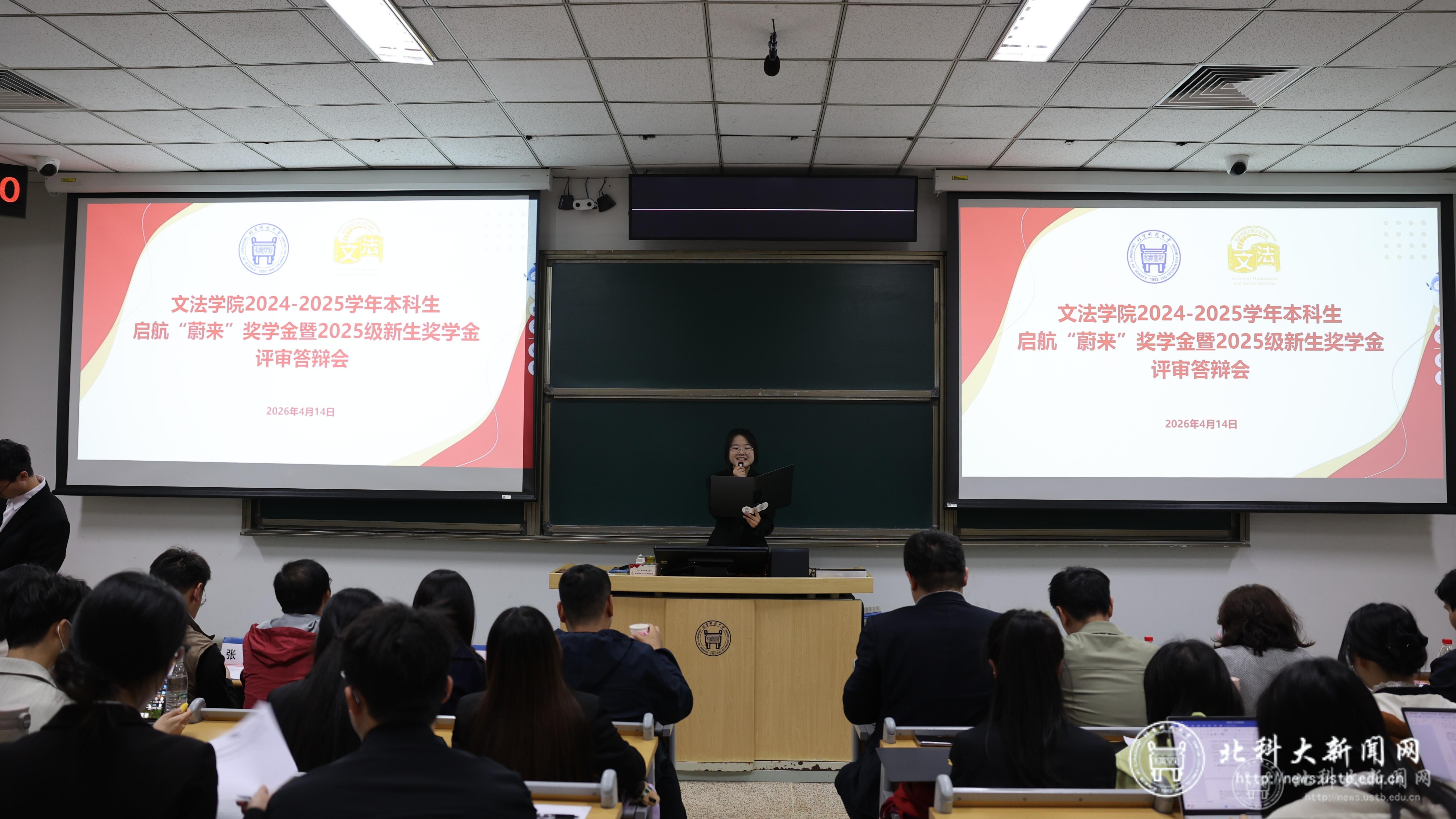 北科大新闻网4月17日电(通讯员 李奕明)4月14日,2024-2025学年启航“蔚来”奖学金暨2025级新生奖学金答辩会在逸夫楼教室举行。文法学院院长毛昊,学生工作部副部长高龑,校团委副书记于林民,文法学院党委副书记、副院长李娟,各系所专业教师代表及本科生辅导员出席本次活动。