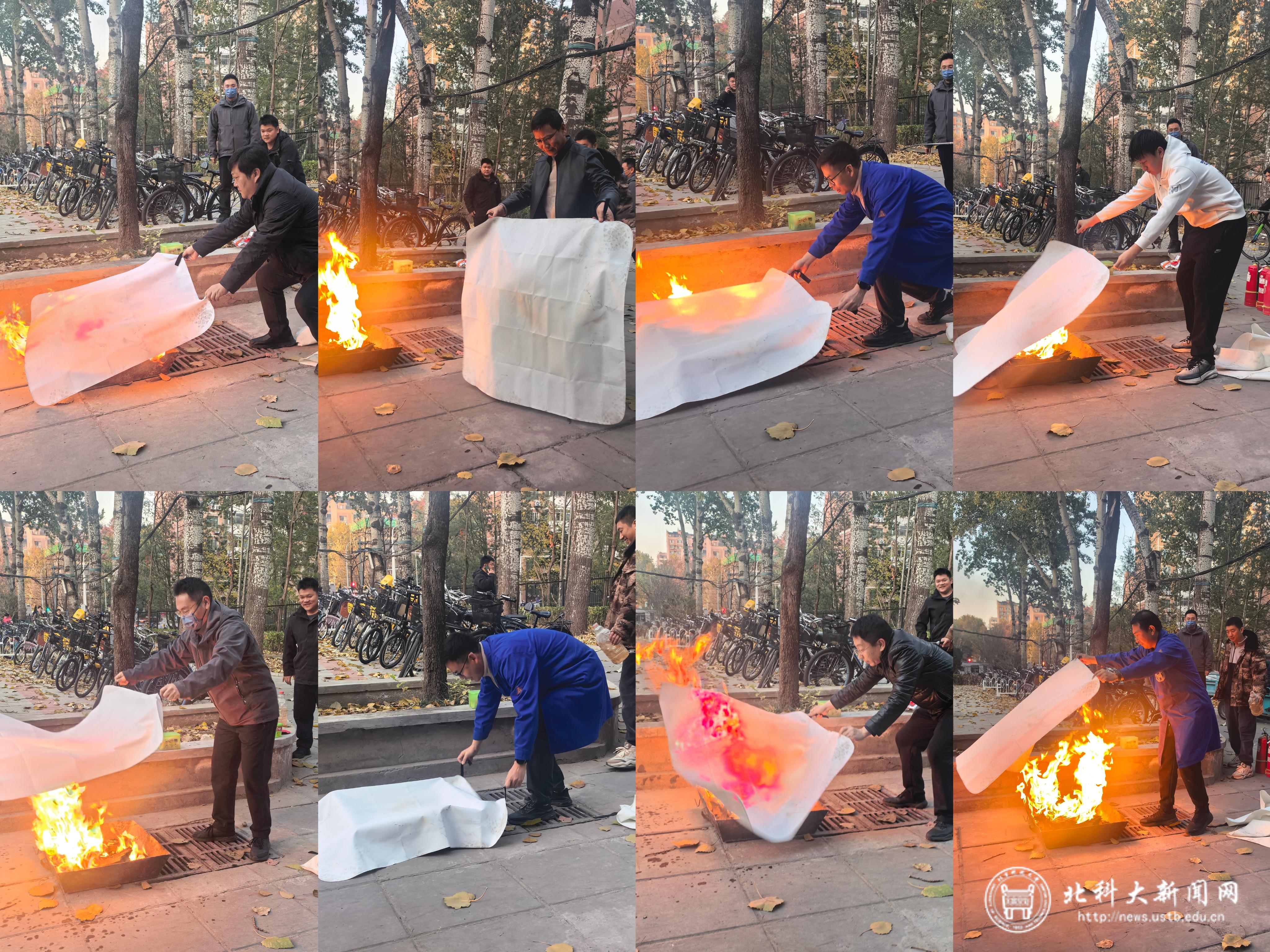 疏散环节结束后,保卫处指导人员在集合点开展消防安全实操培训。指导人员结合金工实习常见火灾隐患,详细讲解了干粉灭火器“提、拔、握、压”的操作要领,以及灭火毯和过滤式消防面具的正确使用方法,重点强调了初起火情的扑救技巧与安全注意事项。在模拟火盆实操区,教职工们轮流上阵,亲身实践灭火毯与消防面具的使用方法。大家严格按照指导人员的要求,实际操作灭火毯,成功扑灭火源。