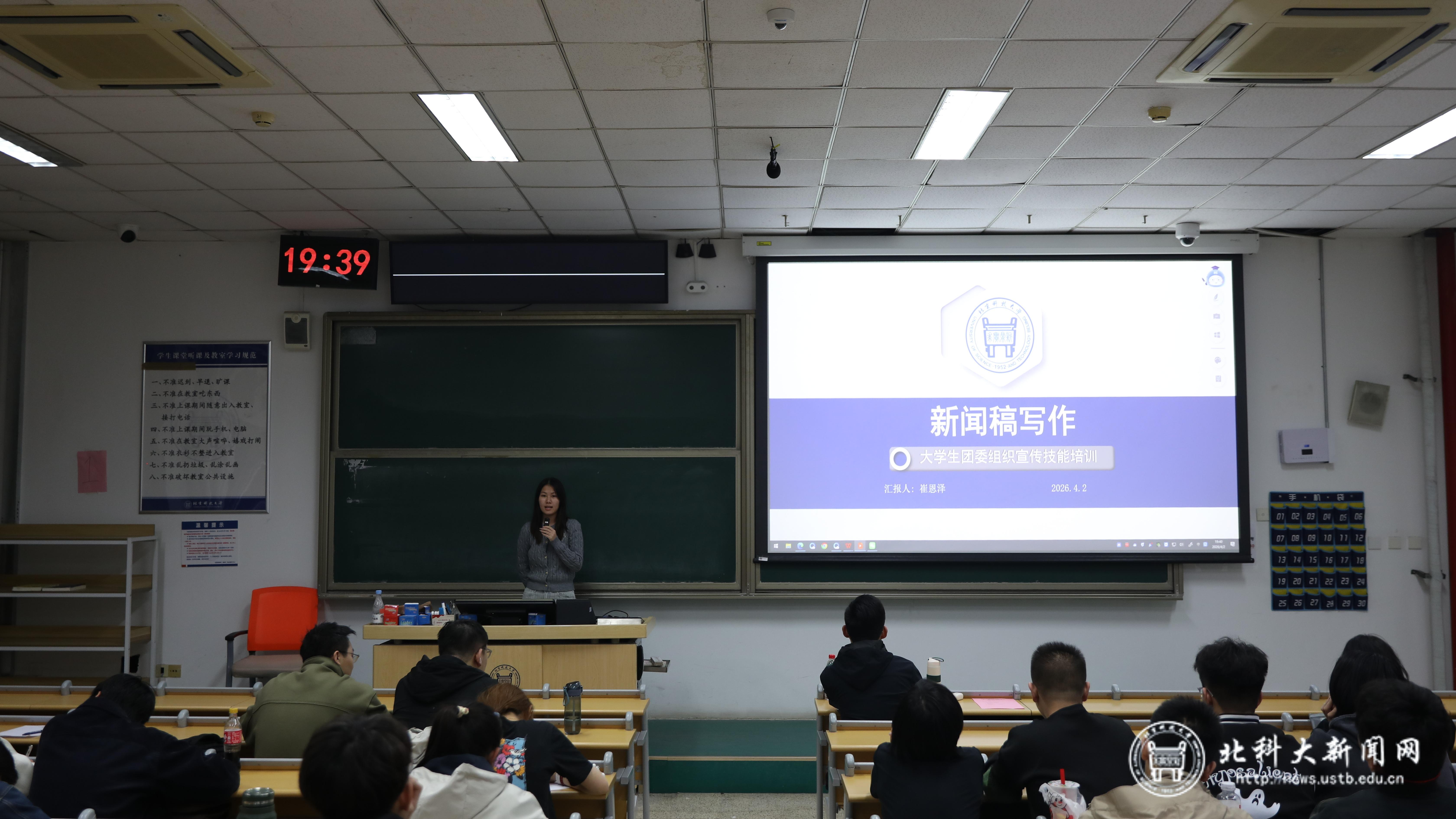 开班仪式结束后,崔恩泽以 “团委新闻稿写作” 为主题作团校第一讲。她围绕新闻基础概念、5W1H 与倒金字塔结构、生动化写作技巧及注意事项展开讲解,结合校园宣传实例拆解标题、导语、正文与配图规范,帮助学员掌握严谨、高效、鲜活的新闻稿撰写方法。