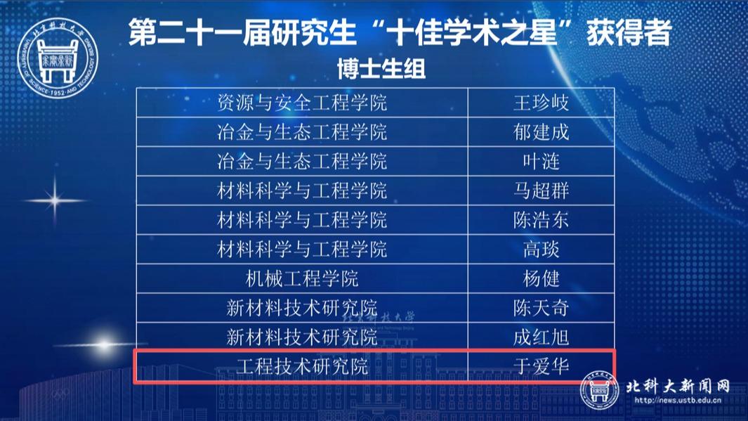 北科大新闻网12月6日电(通讯员 武冬海)近日,学校研究生“十佳学术之星”评选活动圆满落幕,工程技术研究院2021级博士研究生于爱华获第二十一届研究生“十佳学术之星”。