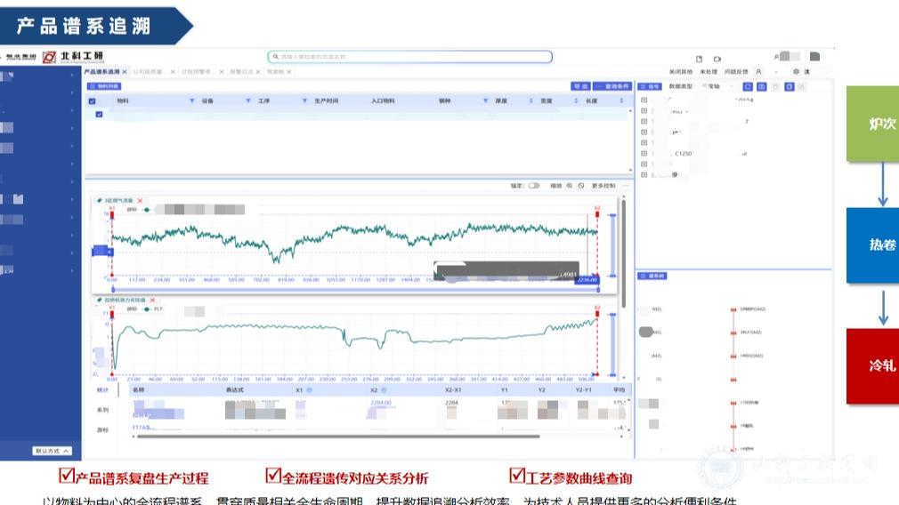 本次上线的核心成果为构建覆盖炼钢-热轧-冷轧数据贯通,完成一炼钢、二炼钢、热卷板及高品钢公司多条产线数据集成,累计接入L1数据点6453项,对接L2/中冠系统接口64张,实现对183台关键设备的实时状态跟踪。通过时空变换模型与物料谱系技术,初步打通从钢水到成品卷的数据链路,形成统一质量追溯“数据地图”,大幅缩短跨工序追溯时间。