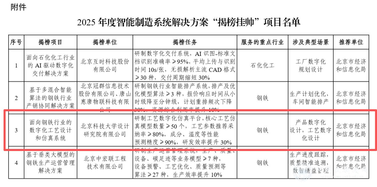 “揭榜挂帅”项目作为国家推动智能制造高质量发展的重要举措,面向重点行业数字化转型智能化升级需求,聚焦智能工厂建设堵点痛点,发掘培育一批掌握核心技术、深耕细分行业、具有工业基因的专业化供应商,推动形成先进适用、自主可控、可复制推广的智能制造系统解决方案产品和服务并应用验证。此次入选,彰显了北科工研在钢铁行业研发数字化方面的创新实力及技术引领。更标志着其数字研发平台解决方案获得国家层面的高度认可,为行业数字化转型树立了新标杆。