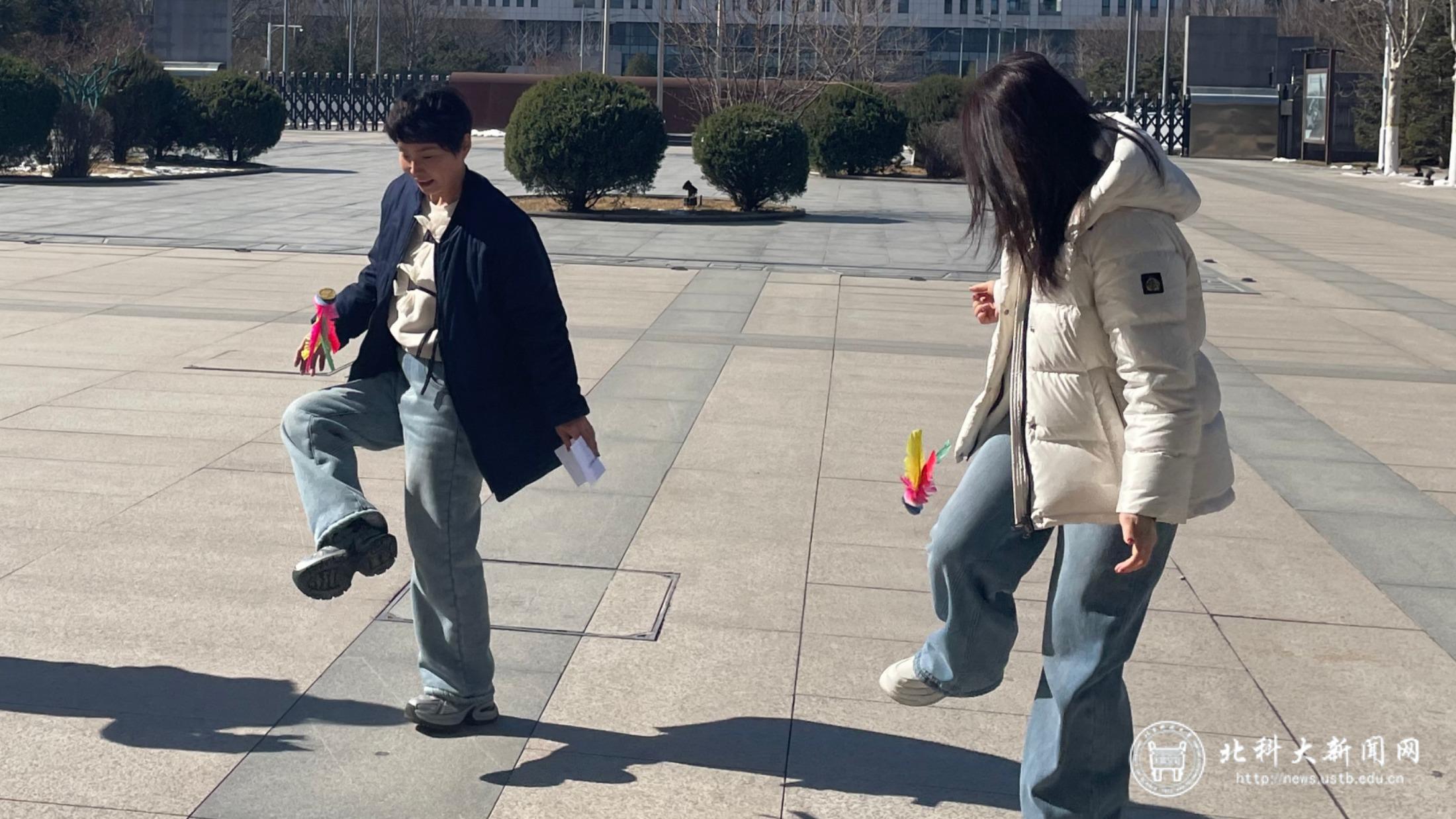 脚尖轻踮,彩毽翻飞,老师们身姿灵巧,腾转挪移间,毽子起落有序。