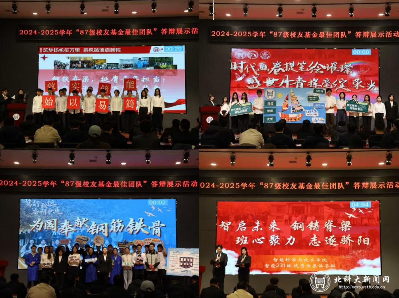北科大新闻网11月21日电(通讯员 陈睿)为深入学习贯彻党的二十大及二十届二中、三中、四中全会精神,落实习近平新时代中国特色社会主义思想与习近平总书记给我校的重要回信精神,营造刻苦钻研、勤奋创新、互帮互学、积极实践的优良学风,交流经验、宣传典型,充分展示我校大学生积极健康的精神风貌与“团结互助、友善诚信、励志成才、温暖如家”的良好班级氛围,学校于11月17日在逸夫科技馆多功能报告厅举办2024-2025学年“87级校友基金最佳团队”答辩展示活动。87级校友基金管理委员会成员代表、热能87级校友白皓学长,学校党委宣传部,保卫处,校团委,招生就业处,校友会、基金会办公室,学生工作部,以及各学院主管学生工作负责人出席活动,各学院的学生代表现场观摩活动。活动通过学校直播平台同步直播。