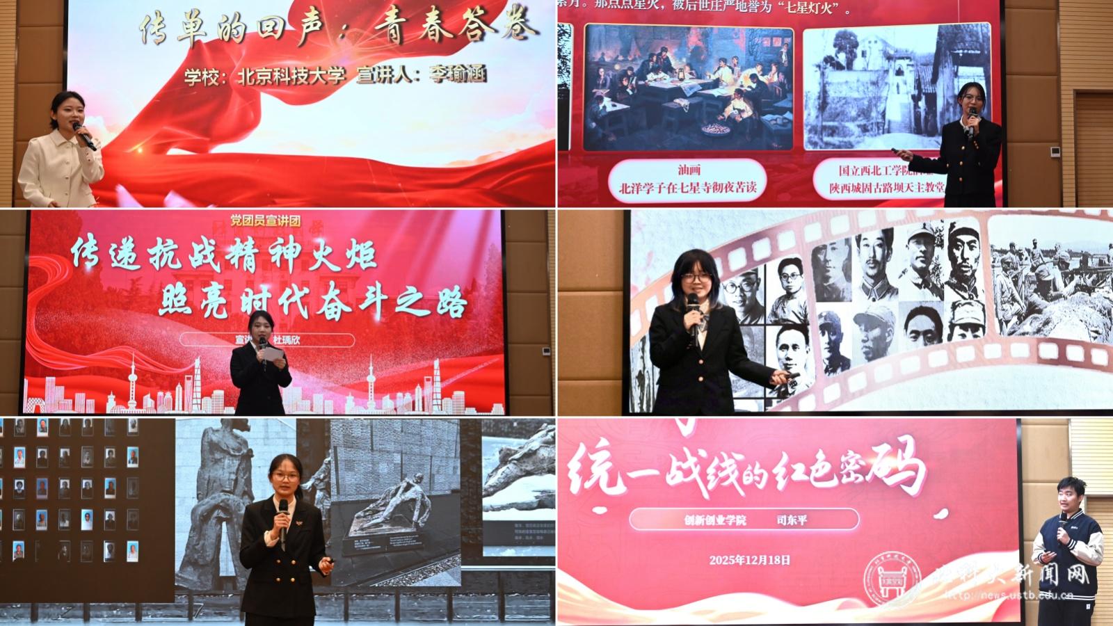 北科大新闻网12月22日电(通讯员 陈睿)为深入学习贯彻习近平总书记在纪念中国人民抗日战争暨世界反法西斯战争胜利80周年大会上重要讲话精神,学习贯彻党的二十大和二十届历次全会精神,近日,学校在图书馆报告厅举办“铭记抗战史,奋进新时代”主题教育活动。学生工作部副部长刘震、校团委副书记孙晓丹、高校思想政治工作队伍培训研修中心(北京科技大学)办公室副主任王亮出席本次活动,特邀嘉宾《中华大典·文献目录典》子总部副主编、江苏卫视《一站到底》总冠军、CCTV-1《绿水青山看中国》总冠军、马克思主义学院历史与文化研究所教师刘澍对活动点评指导。