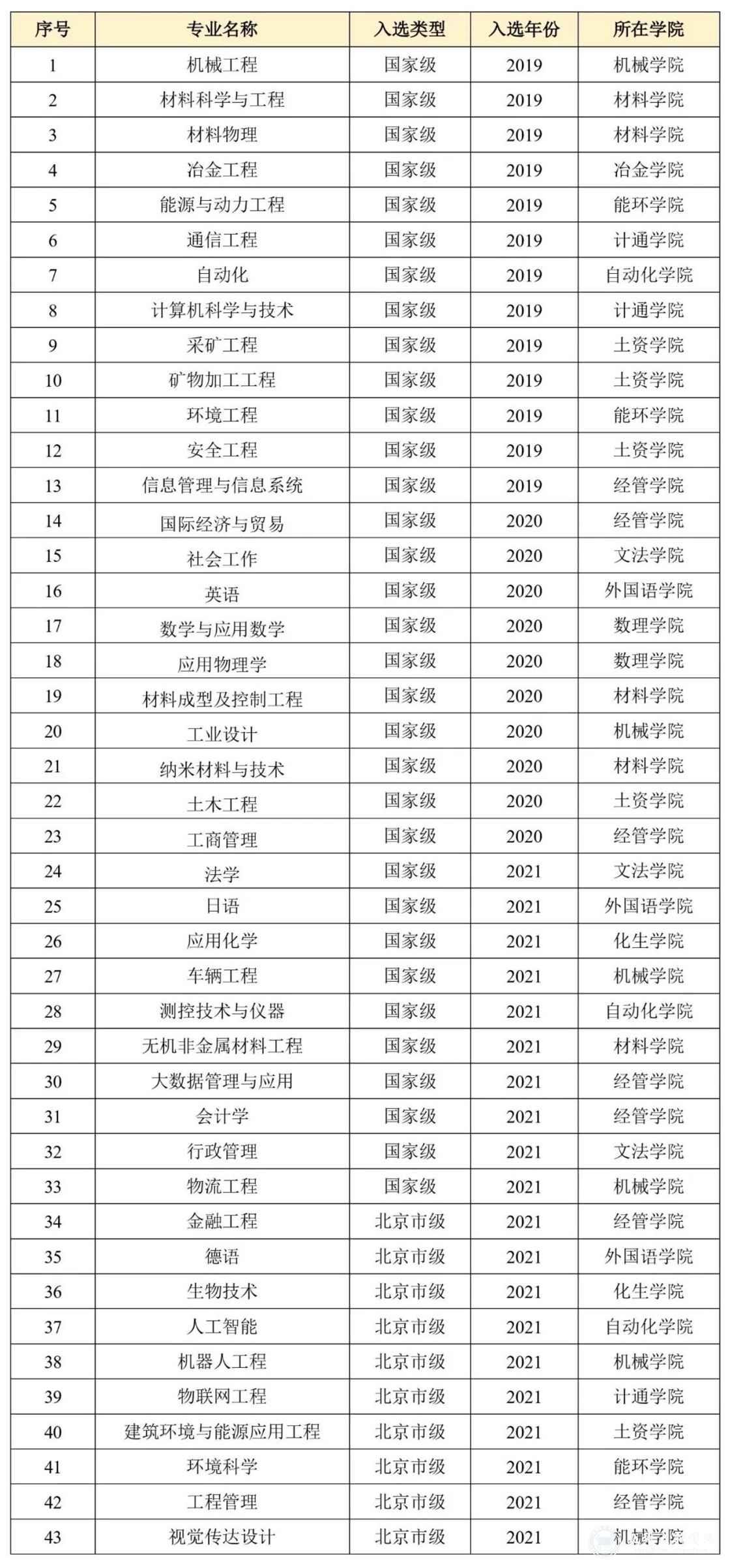 教育部2019年4月起实施一流本科专业建设“双万计划”,计划在2019—2021年建设10000个左右国家级一流本科专业点和10000个左右省级一流本科专业点,旨在全面振兴本科教育,提高高校人才培养能力,实现高等教育内涵式发展。截至目前,我校共有43个一流本科专业建设点,其中国家级33个、北京市级10个。