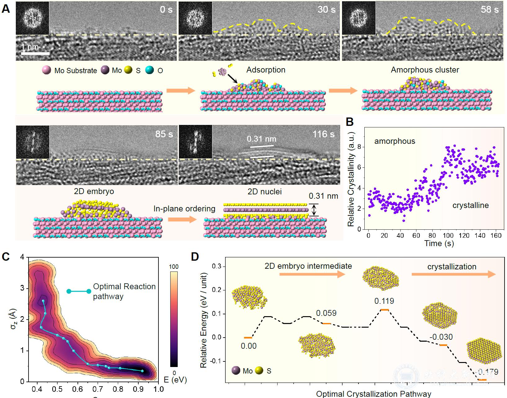 研究团队创新性地开发了兼容ETEM的微型CVD反应腔,在精准复刻CVD制备环境的同时,首次实现了 MoS2 生长过程的原子尺度原位观测。研究发现,在反应条件下,前驱体气化并吸附到衬底表面形成非晶团簇,经过化学与结构重整演化为面内无序的二维晶胚;当二维晶胚长大至约2 nm时,内部原子发生有序化转变,形成稳定的MoS2晶核。结合分子动力学模拟,系统揭示了非晶团簇、二维晶胚到MoS2晶核的能量演化路径,从实验与理论两方面验证了MoS2非经典成核路径。此外,捕捉到了晶核在早期生长阶段的聚合与取向附着行为,阐明了其在降低晶界密度、促进单晶生长中的关键作用。