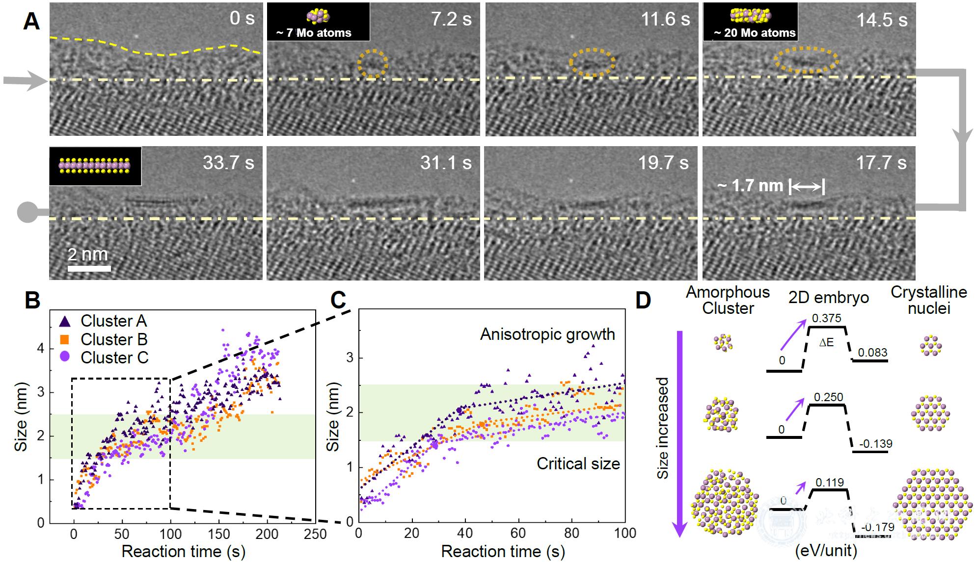 该研究为长期以来主要依赖理论推演的原子尺度二维晶体成核机制提供了直接的实验证据,深化了对二维晶体成核生长动力学的理解,完善了晶体非经典成核理论体系。临界尺寸的确认及晶核早期生长行为的揭示,为调控MoS2单晶生长提供了全新切入点,有望实现二维晶体取向与质量的精准控制。这项研究不仅验证了原位研究的科学价值,更展现了原位表征技术在破解材料生长“黑箱”中的重要作用。同时,相关机制和方法有望推广至其他晶体体系的研究。