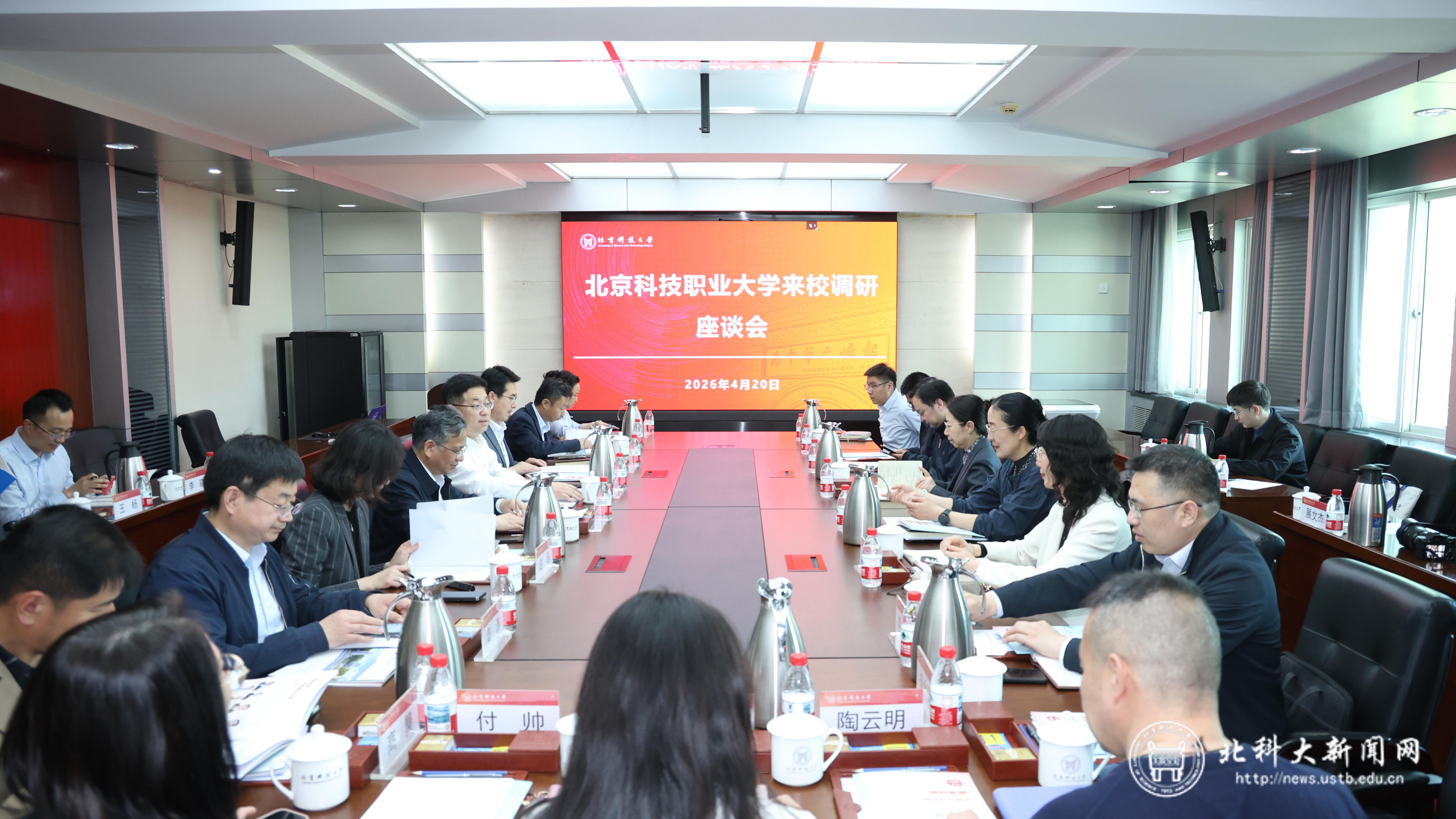 北科大新闻网4月23日电(通讯员 张君琳)4月20日,北京科技职业大学党委书记董竹娟带队来校调研,围绕“钢筋铁骨”育人共同体和学生思想政治工作、马克思主义学院建设、基层党建和年轻干部培养工作等进行调研座谈。学校党委书记徐晓萍会见董竹娟一行。北京科技职业大学党委副书记刘蓉、徐江波,学校党委副书记孙景宏、副校长彭庆红出席调研座谈会。