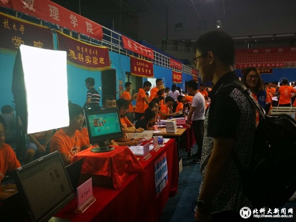 上午9点多,北科大校园内已经已经有不少拖着行李前来报到的学生、家长。在办理报到手续的学校体育馆内,新生们纷纷在各个学院展台前进行咨询。在高等工程师学院、化学与生物工程学院展台前,前来报到的新生站在一台配置有摄像头的电脑前“刷脸”,经系统识别后,与之相连的工作人员的电脑上就可以显示出这名学生的姓名、专业、学号、照片等个人信息,随后工作人员再按照专业、班级分类为新生办理报到手续。