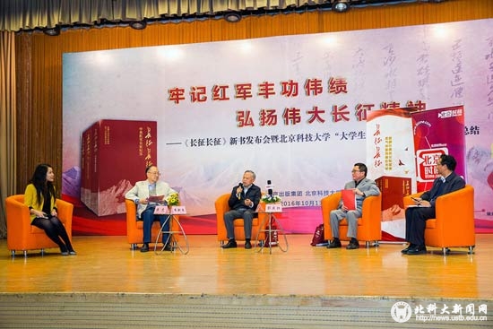 为纪念中国工农红军长征胜利80周年,10月13日北京出版集团联合北京科技大学举办了“牢记红军丰功伟绩 弘扬伟大长征精神——《长征长征》新书发布会暨北京科技大学‘大学生重走长征路’社会实践总结”活动。中宣部出版局图书处处长何瑞,北京市新闻出版广电局副局长王野霏,北京市委宣传部出版处副处长蔡宁,北京出版集团总编辑李清霞,北京科技大学副校长王维才,北京科技大学马克思主义学院院长彭庆红,党史专家王新生,军事专家及图书作者陈虎及250余名师生代表出席了会议,活动由北京电视台新闻中心主持人孙天旭主持。