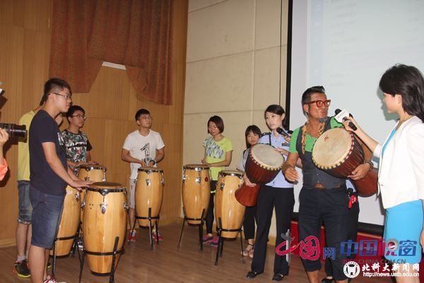 戒毒志愿者孙兴(右2)和北京市新河强制隔离戒毒所张薇警官(右3)一起展示戒毒工具之一音乐鼓的作用和同学们一起演奏击鼓